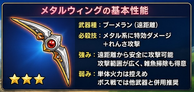 『ドラゴンクエストスマッシュグロウ』(通称:ドラクエスマグロ / スマグロ)で、リセマラやメタルシリーズふくびきで狙う人が多い星3ブーメラン武器メタルウイング。